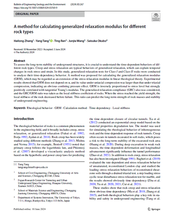 文献引用:Zhang, H., Tang, Y., Ren, T., Wang, J., Okubo, S. A Method for Calculating Generalized Relaxation Modulus for Different Rock Types. Bulletin of Engineering Geology and the Environment, 2024, 83:267:1-11.