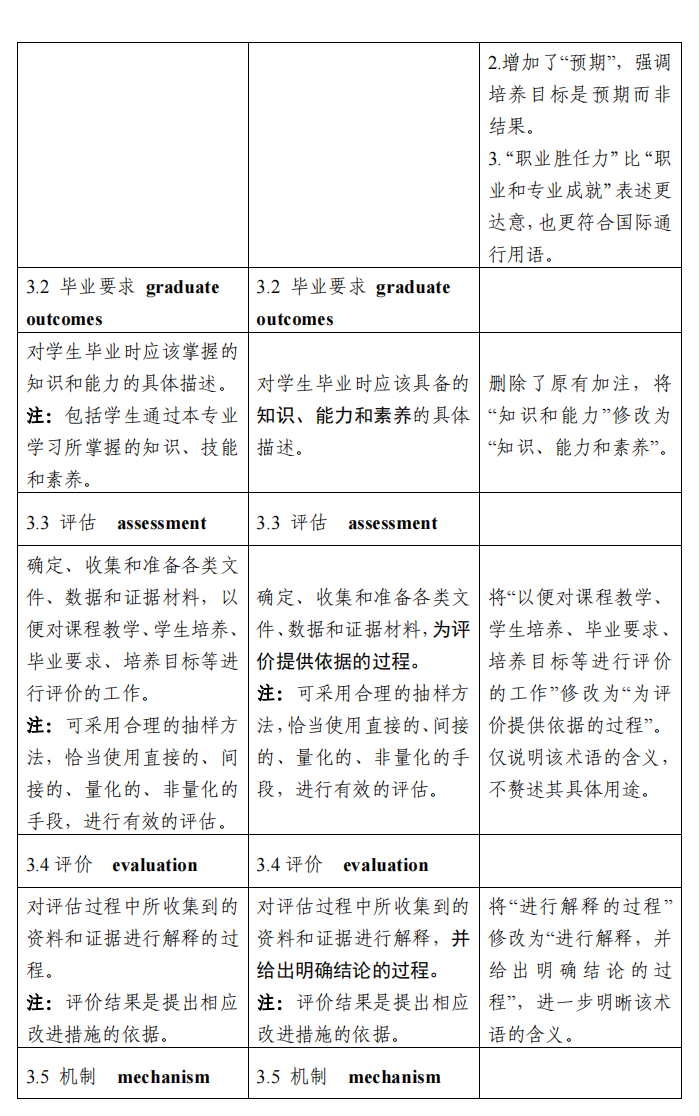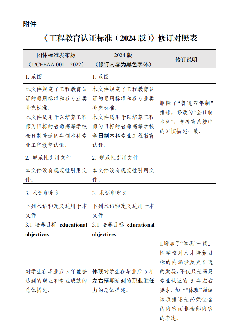 5. 部分表述修订。对“培养目标”“毕业要求”“复杂工程问 题”“评估”“评价”“机制”的定义释义以及对标准部分内容表 述进行了修改完善。 具体修订内容及修订说明见附件《工程教育认证标准 (2024 版)》修订对照表。 附件:《工程教育认证标准(2024 版)》修订对照表