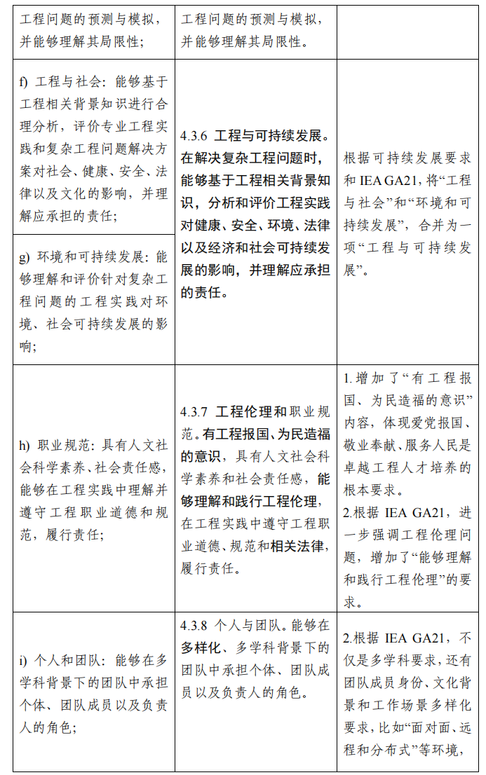 2. 落实《毕业生要求与职业能力框架》(GAPC2021)有 关修订要求,提升人才竞争力。一是在高度信息化、智能化 的时代,强调学生计算思维和应用能力的培养,增设了“计算” 类知识和能力要求;二是在日新月异的技术变革时代,强调 学生创新创造能力的培养,增加了设计和开发“体现创新性 的解决方案”和“批判性思维能力”的要求;三是在多样化、包 容性的工程活动中,强调学生适应能力的培养,能够在“多样 化的团队或工作环境中”开展团队合作,并能“理解尊重语言、 文化差异”。